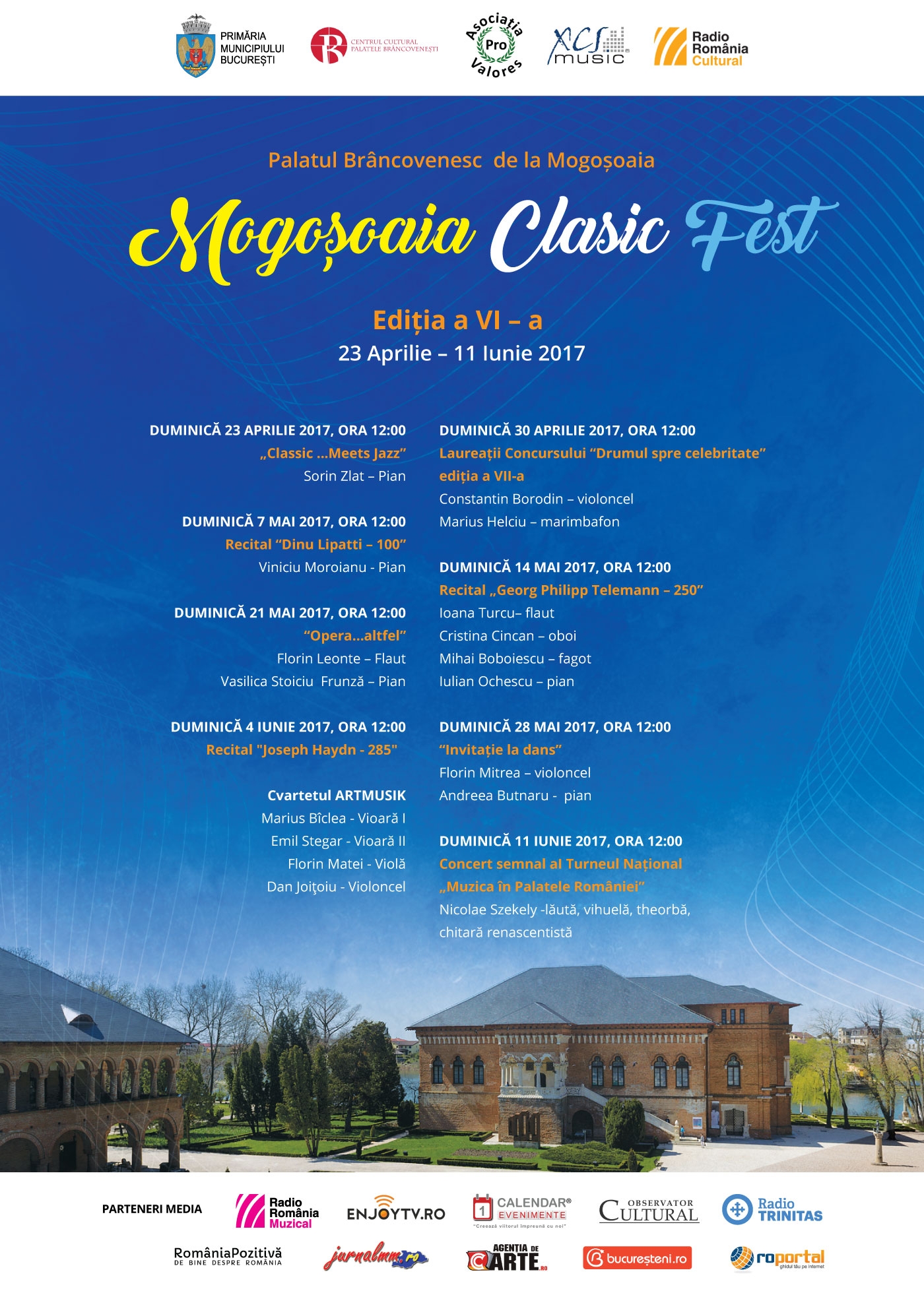 Ediţia a VI-a a Mogoşoaia ClasicFest propune pe parcursul a opt duminici, opt recitaluri inedite, susţinute de muzicieni de primă valoare, o expoziţie fotografică intitulată “Instantanee sonore”, semnatarul lucrărilor fiind artistul fotograf Mihai Benea, lansări de carte şi prezentări ale unor noutăţi discografice.
