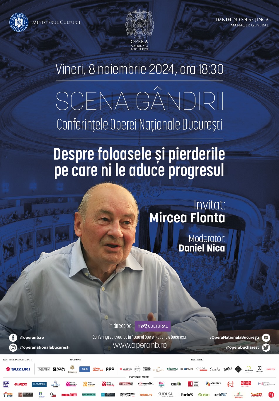 Pe 8 noiembrie 2024, începând cu orele 18.30, Opera Națională București va găzdui o nouă ediție din seria Scena Gândirii – Conferințele Operei Naționale București. Invitatul ediției va fi academicianul Mircea Flonta, profesor emerit la Facultatea de Filosofie a Universității din București. Conferința domniei sale, intitulată „Despre foloasele și pierderile pe care ni le aduce progresul”, va oferi publicului o reflecție profundă asupra schimbărilor pe care le trăim în contextul avansului tehnologic și social al umanității.