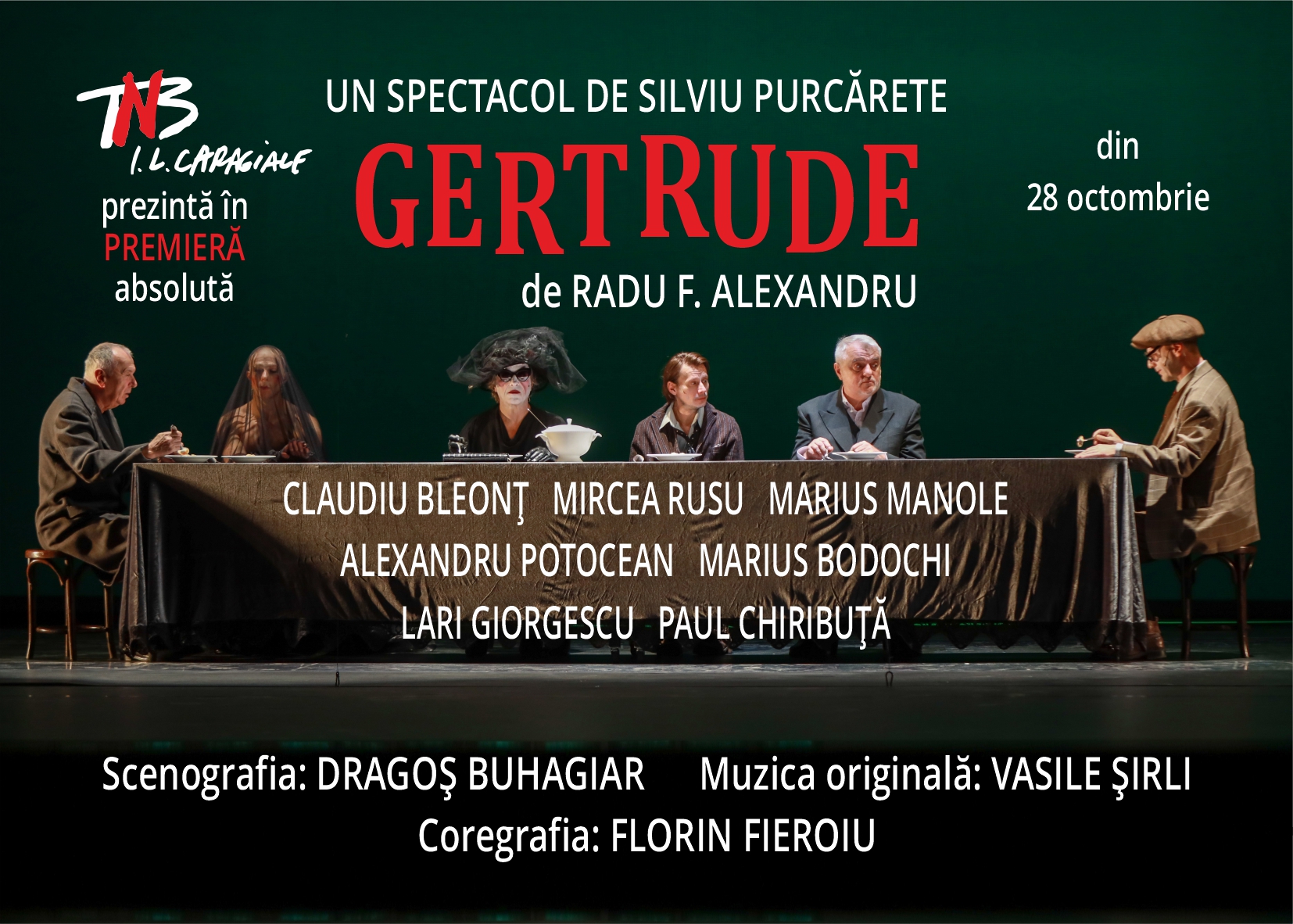 Regizorul Silviu Purcărete revine la Teatrul Național „I.L.Caragiale”, după 11 ani, împreună cu echipa sa fidelă de colaboratori – Dragoș Buhagiar – scenografia, Vasile Șirli – muzica, pentru a pune în scenă, în premieră absolută, Gertrude de Radu F. Alexandru.