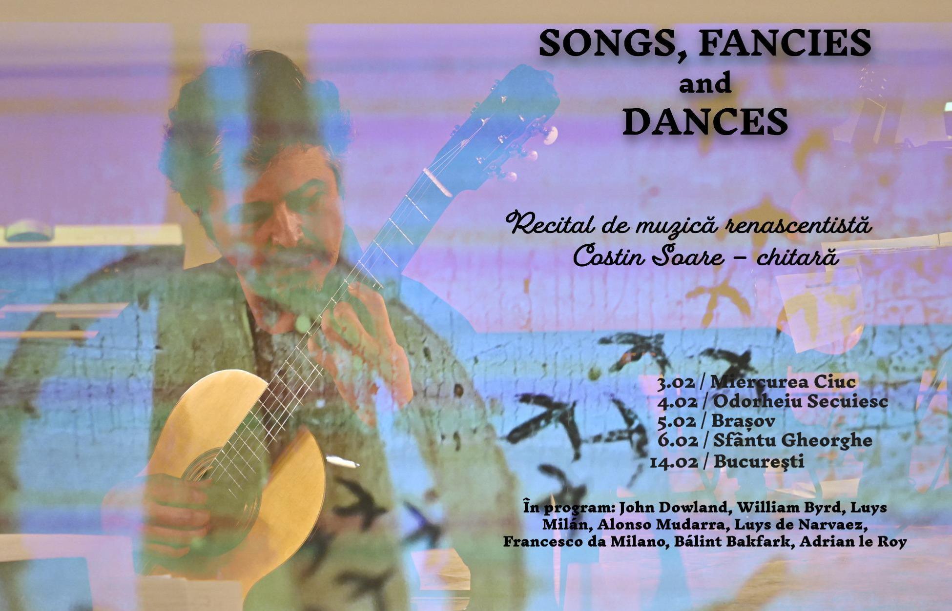 În perioada 3-14 februarie, chitaristul Costin Soare va susține o serie de recitaluri cu un program integral de muzică renascentistă, o panoramă a principalelor genuri muzicale dedicate unor instrumente emblematice ale epocii: lăuta și vihuela. Intitulat „Songs, Fancies and Dances”, recitalul propune o călătorie muzicală în Anglia, Spania, Italia, Ungaria și Franța, cu lucrări compuse de către unii dintre cei mai importanți compozitori-interpreţi ai vremii: de la contemporanul lui Shakespeare, John Dowland, lutist la curtea reginei Elisabeta I, la Bálint Bakfark, muzicianul maghiar născut la Braşov, Orpheus Pannoniae, cum îl numea polonezii; de la pleiada de interpreți la vihuela din Secolul de aur al muzicii spaniole, precum Luis Milan, Alonso Mudarra, Luys de Narvaez, la cel supranumit Il Divino, italianul Francesco da Milano.