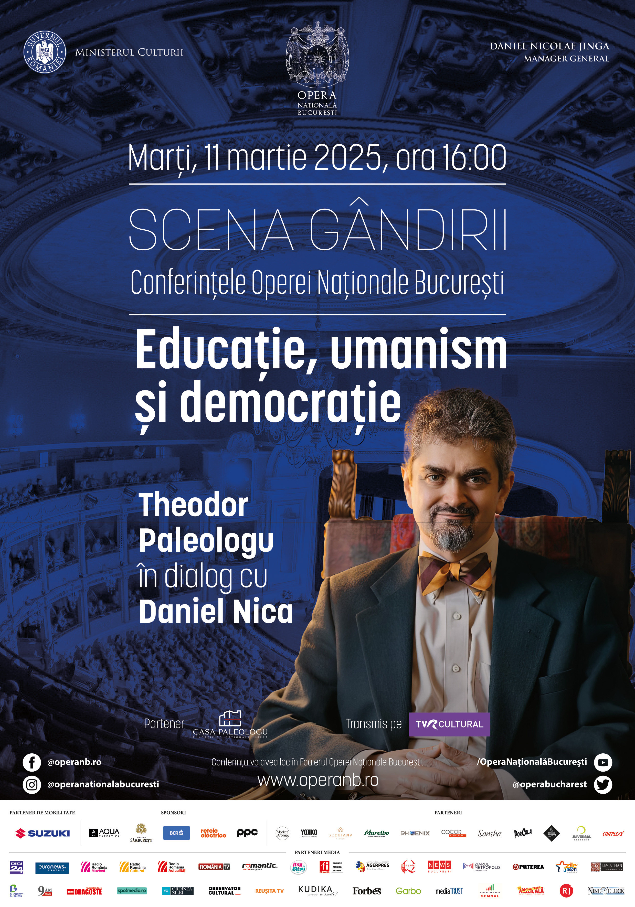 Pe 11 martie, de la ora 16:00, invitat la Scena Gândirii – Conferințele Operei Naționale București va fi Theodor Paleologu, eseist, diplomat și profesor, într-un dialog despre educație și democrație, alături de Daniel Nica. Întâlnirea va aduce în prim-plan rolul disciplinelor umaniste în formarea unei viziuni mature asupra societății și în cultivarea spiritului civic.