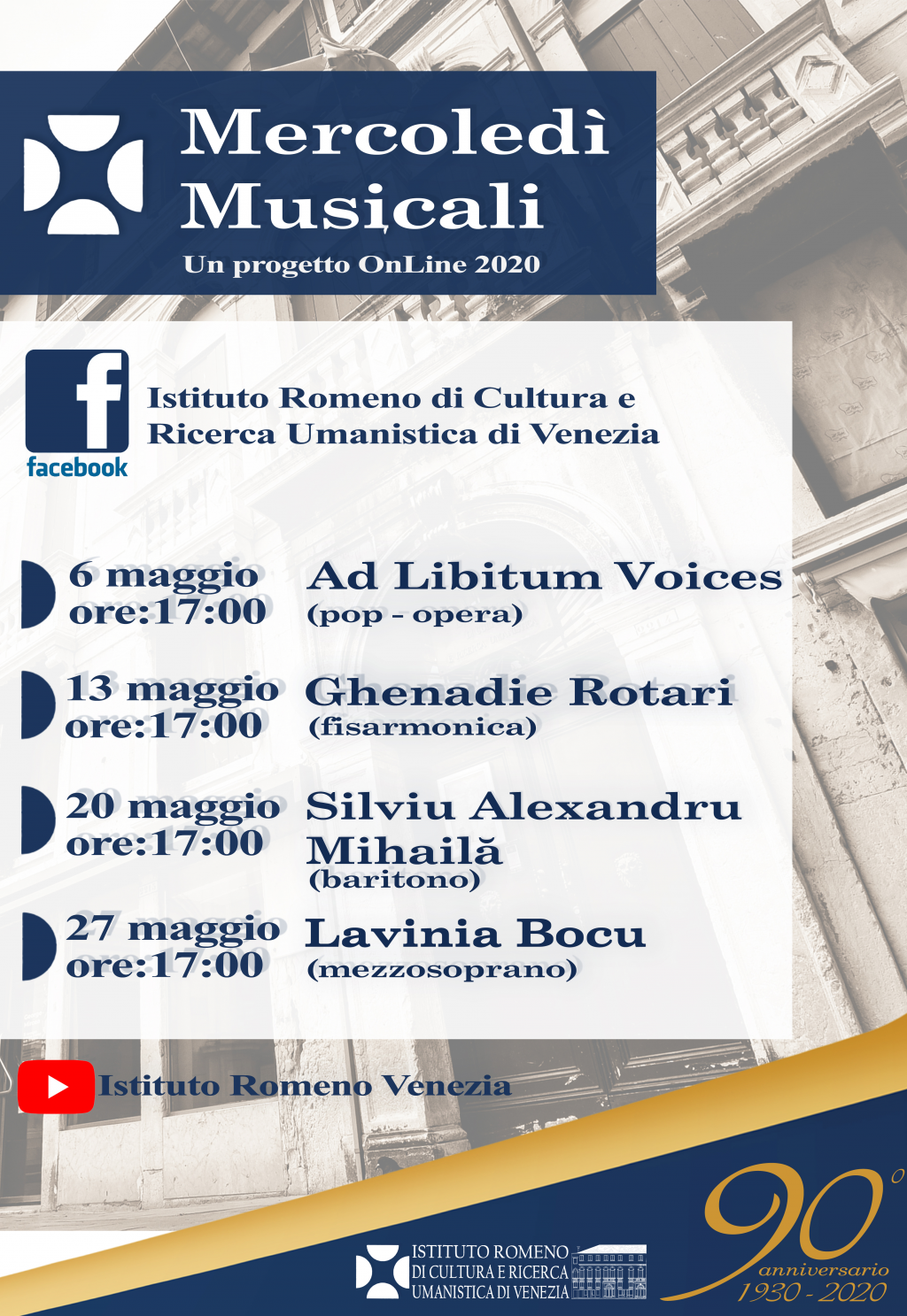 „Mercoledi Musicale”(„Miercurea Muzicală”), un nou proiect al Institutul Român de Cultură şi Cercetare Umanistică de la Veneţia se va desfăşura în perioada 6 – 27 mai 2020 şi va aduce în atenţia publicului italian tineri artişti muzicieni români. În fiecare zi de miercuri a lunii Mai, începând cu 6 mai, de la ora 17:00 (ora Italiei) pagina de facebook a Institutului şi canalul de youtube vor găzdui un material inedit cu tinerii muzicieni. Materialul va conţine un scurt recital însoţit de un mesaj adresat publicului.
