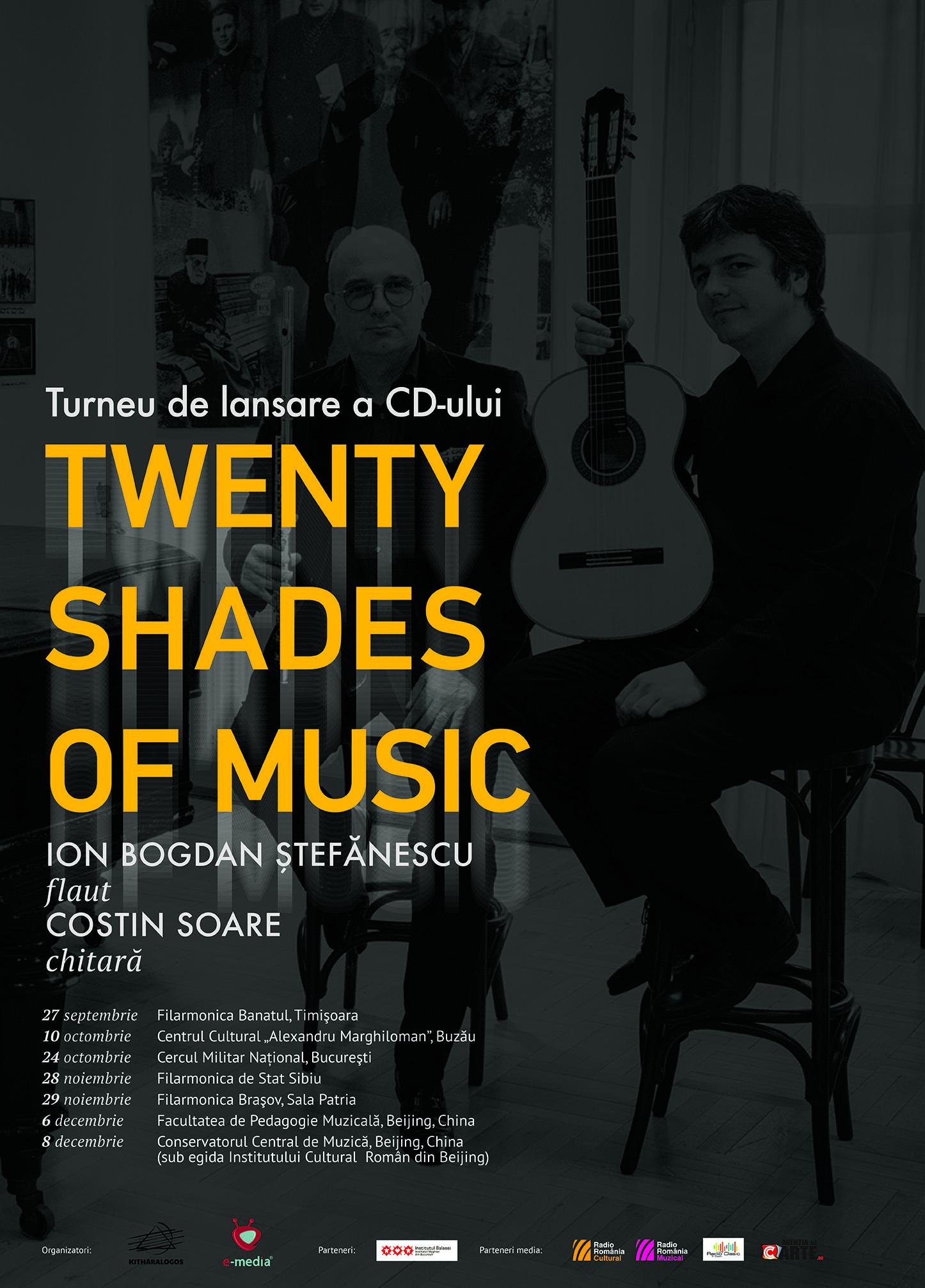 La sfârşitul lunii septembrie, în sala de concerte a Filarmonicii Banatul din Timişoara, a avut loc primul concert din turneul de lansare a CD-ului “Twenty Shades of Music”, ai cărui protagonişti sunt doi dintre cei mai apreciaţi şi activi muzicieni români: flautistul Ion Bogdan Ştefănescu şi chitaristul Costin Soare. O propunere unică pentru piaţa muzicală din România, combinaţia sonoră perfectă de flaut şi chitară aduce în prim plan exotismul, nuanţele subtile, emoţiile primare conţinute în muzica Americii Latine şi a Balcanilor, de la Istoria tangoului de Astor Piazzolla la Dansurile româneşti de Bela Bartok, de la muzica populară braziliană la cea macedoneană. “Twenty Shades of Music” reprezintă o adevărată jubilaţie a muzicii, fiecare dintre cele 20 de dansuri fiind o explozie de melodie şi ritm, de senzualitate şi exuberanţă.