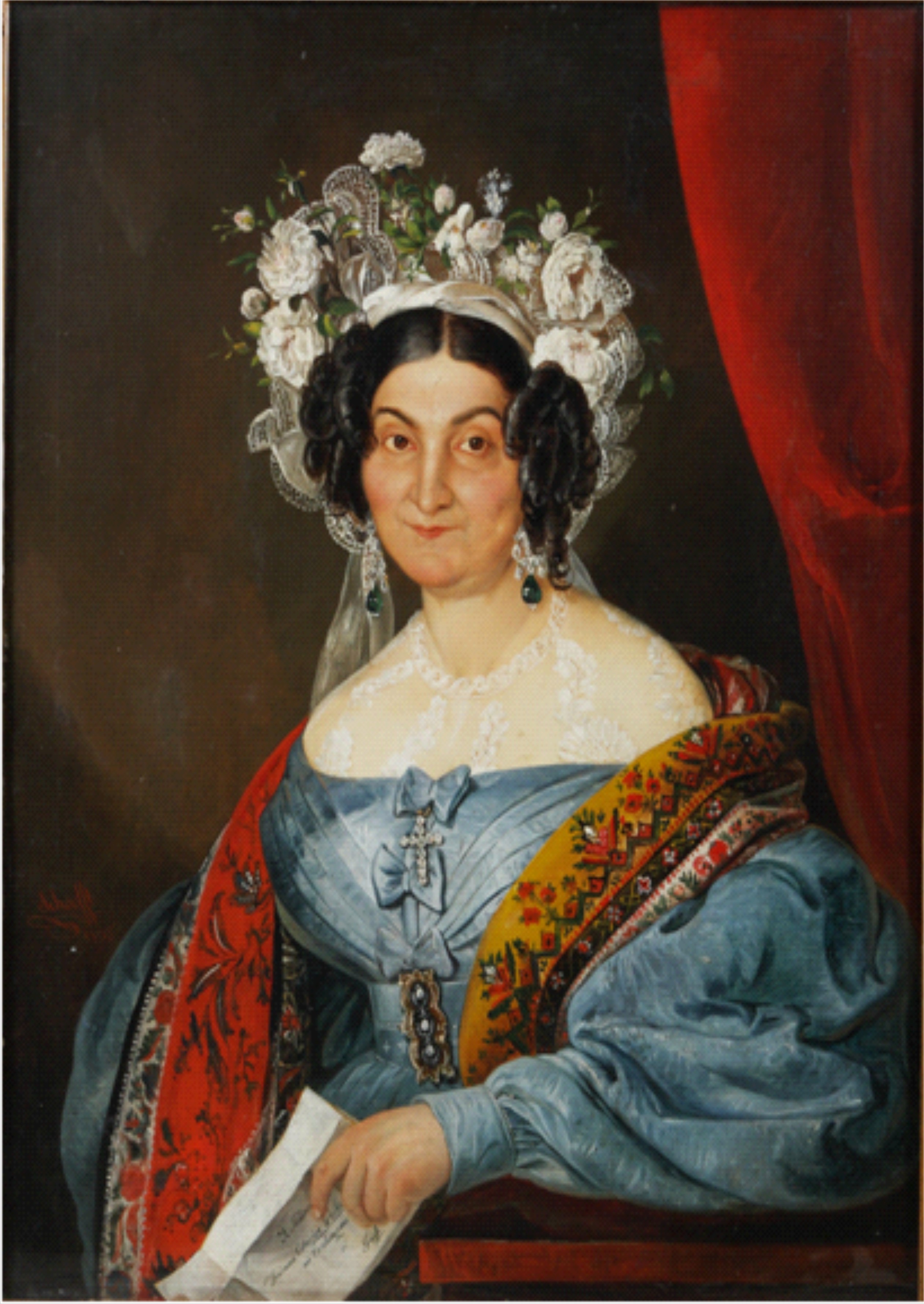 Lucrarea din imagine, realizată de artist în cea mai bună factură Biedermeier, o prezintă pe Ecaterina Ghica, născută Cantacuzino, după cum putem citi în scrisoarea ce îi fusese adresată și pe care aceasta o ține în mână. Ne atrage atenția rochia oarecum exotică, dar care era la modă în Europa în 1835, an când acest portret a fost pictat. Remarcăm decolteul adânc și mânecile foarte largi, numite „urechi de elefant”. Rochia este purtată alături de un sofisticat aranjament de păr, așezat pe o coafură la modă la care se disting numeroase bucle ce acoperă urechile. Șalul oriental, un element vestimentar care se purta în întreaga Europă, întregește această ținută.