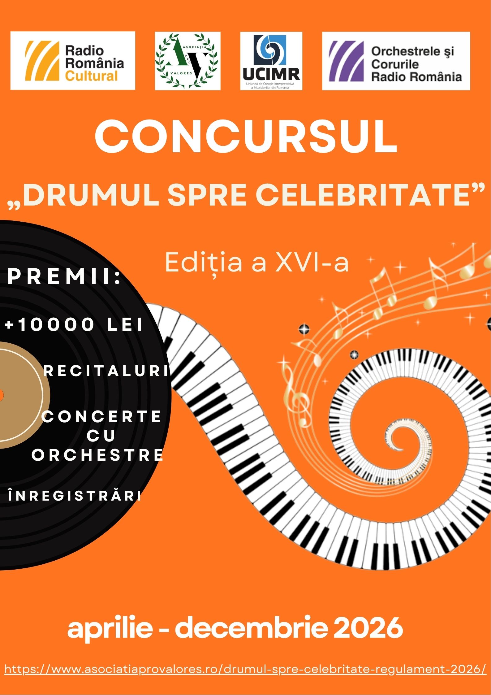 Asociația Pro Valores, Radio România – prin Orchestrele și Corurile Radio, Radio România Cultural și Uniunea de Creație Interpretativă a Muzicienilor din România lansează cea de-a 16-a ediție a Concursului „Drumul spre celebritate”. Noua formula s-a dovedit a fi de un real succes și va continua și în acest an cu un maraton de trei etape, o întrecere artistică serioasă, echidistantă, care să descopere adevăratele talente muzical interpretative și să le promoveze.