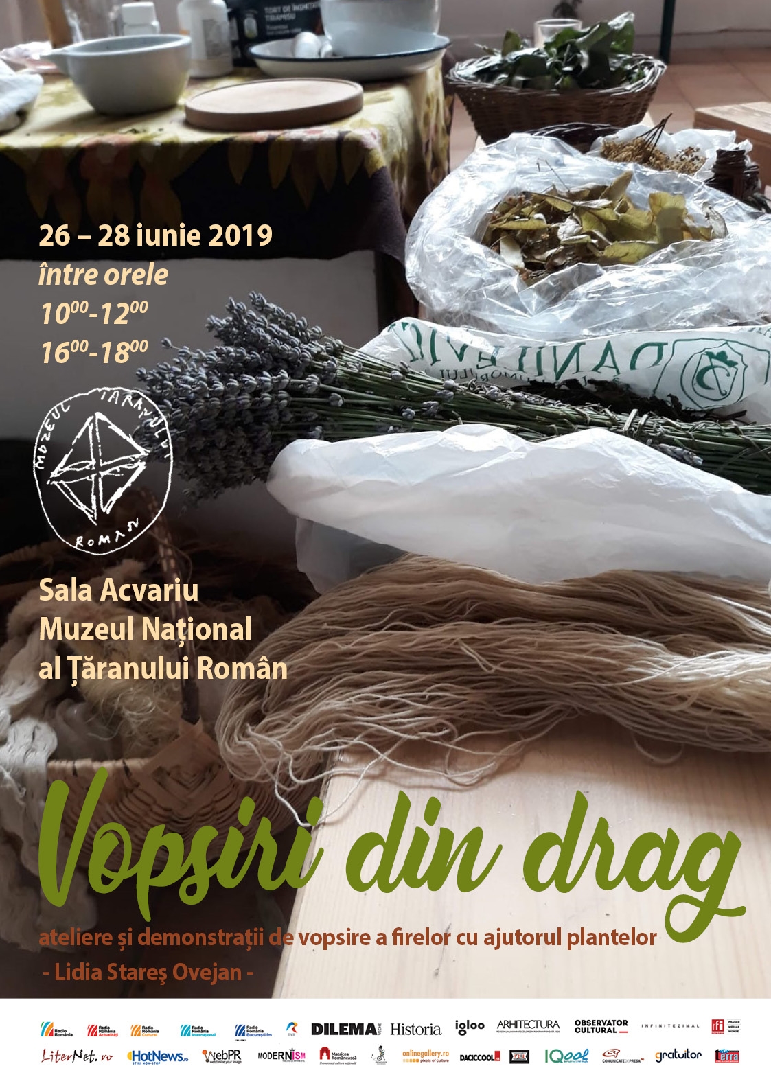 Muzeul Naţional al Ţăranului Român vă aşteaptă în perioada 26 – 28 iunie 2019, între orele 10:00 – 12:00 şi 16:00 – 18:00, la Vopsiri din drag – o serie de ateliere şi demonstraţii de vopsire a firelor naturale cu ajutorul plantelor. Atelierele vor fi susţinute la Sala Acvariu de Lidia Stareş Ovejan, artist plastic, muzeograf şi profesor.